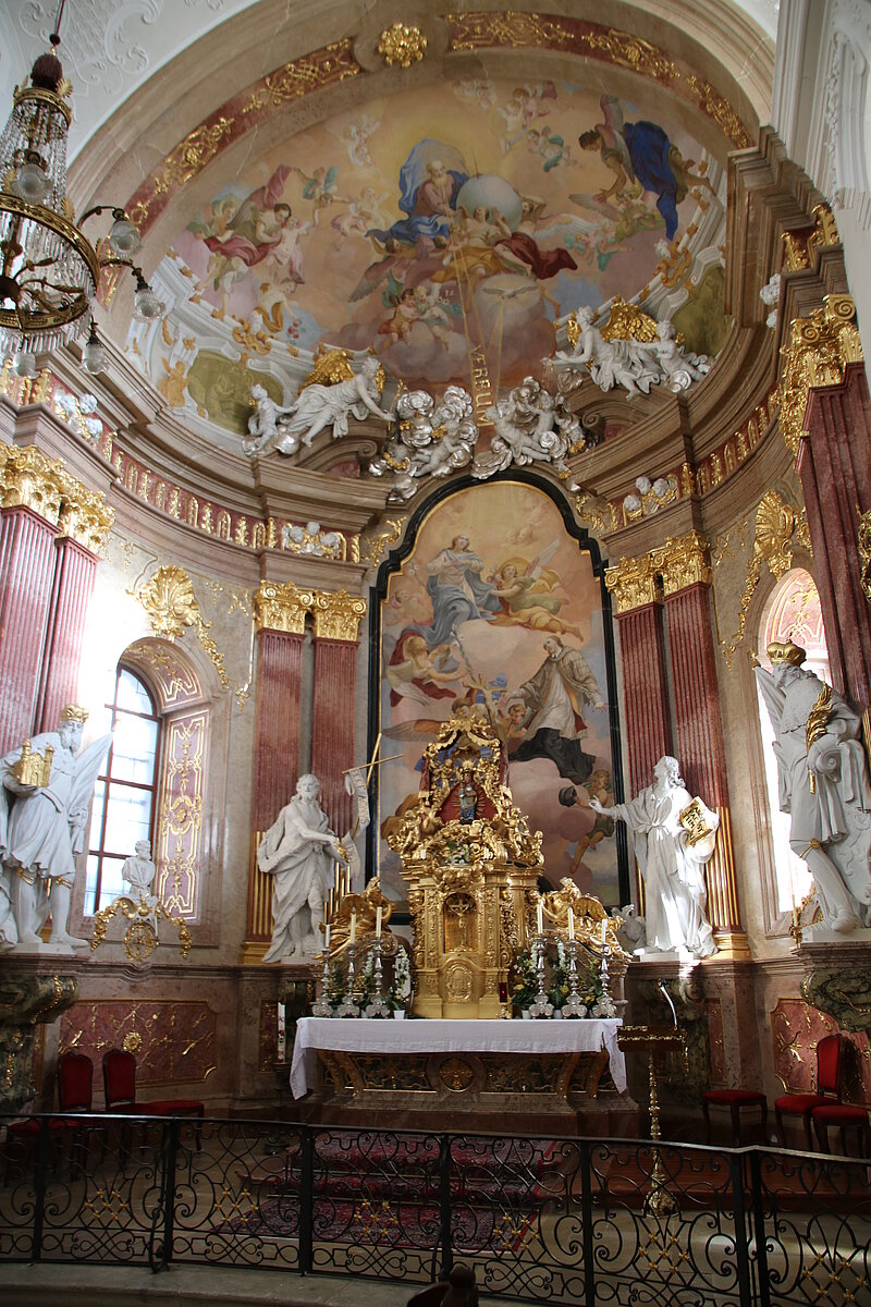 Tulln, ehem. Minoritenkirche - Kirche hl. Johannes Nepomuk, 1732-39 errichtet, Hochaltar, Gesamtkomposition von Architektur, Plastik und Wandmalerei, um 1730