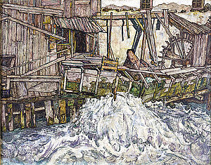 Die "Zerfallende Mühle" von 1916 ist ebenfalls von dieser Inhaltlichkeit geprägt. Schiele schilderte die morbide Schönheit eines "verwesenden", von Menschenhand geschaffenen Gebäudes, morsches, unter der Last des Wassers nachgebendes Holz, zusammenbrechende Bauteile. An der Situation ist nichts, was Sentimentalität oder Trauer hervorrufen könnte. Vielmehr bringt sie eine Hoffnung zum Ausdruck, die Hoffnung auf die ewig junge, sich beständig erneuernde Kraft der Natur. Das aus dem desolaten Mühlgang hervorquellende Wasser kann als Sinnbild hierfür angesehen werden. Auch die den Bau überziehenden Moose und Flechten sind erste Anzeichen für eine nicht aufzuhaltende Rückeroberung durch die Natur.