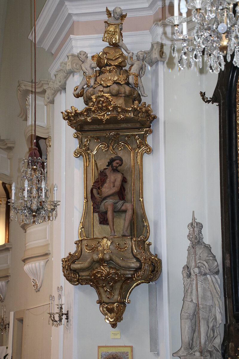 Der Ort entwickelte sich aus einer Brückensiedlung mit zwei Siedlungskernen beiderseits des Flusses. Die westliche Siedlung im Bereich des Römerlagers und der ehemaligen Kirche Maria Anger war vermutlich älter. Die Kirche wird erstmals 1267 genannt und war eine Filiale, später ein Vikariat von St. Stephan in Wien. 1815 wurde das Kirchenvermögen auf die ehemalige Kapuzinerkirche übertragen und die Kirche mit Ausnahme der heute als Friedhofskapelle genutzten Seitenkapelle abgebrochen. Der östliche Ortsteil entstand um die Kirche St. Jakob, die vor 1300 erbaut und 1360 Pfarre wurde. Mitte des 18. Jahrhunderts wurde die Pfarrkirche von Baumeister Johann Georg Ebruster zusammen mit Pfarrhof und Schule als barockes, eine Ehrenhofanlage bildendes Ensemble neu erbaut (1755/1756). Stifter des Neubaus war der Direktor der Kattunfabrik Zailner von Zailenthal.